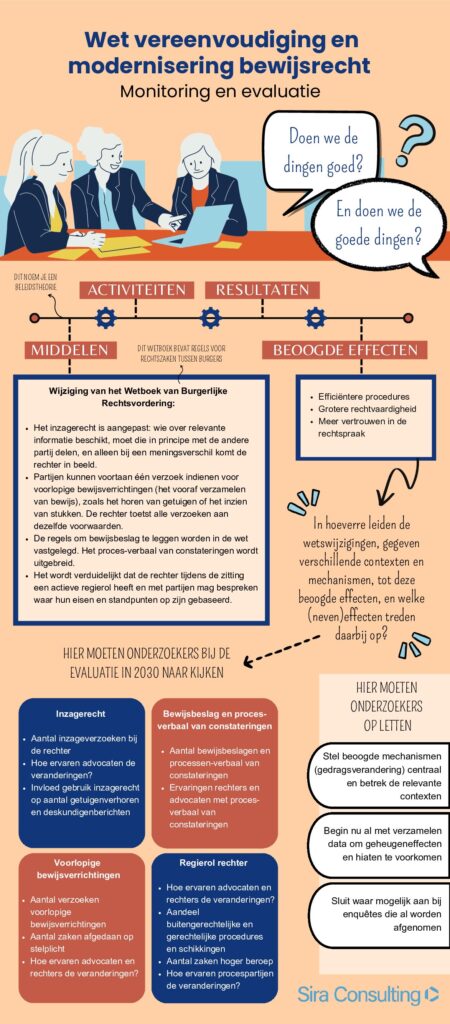 In opdracht van het Wetenschappelijk Onderzoek- en Datacentrum (WODC) voerde Sira Consulting een planevaluatie uit van de Wet vereenvoudiging en modernisering bewijsrecht. Een planevaluatie is kortgezegd een ‘plan voor een evaluatie’. Dit houdt in dat in kaart is gebracht hoe en op welke onderdelen monitoring en dataverzameling moet plaatsvinden, om zo een goede basis te bieden voor de daadwerkelijke evaluatie in 2030.